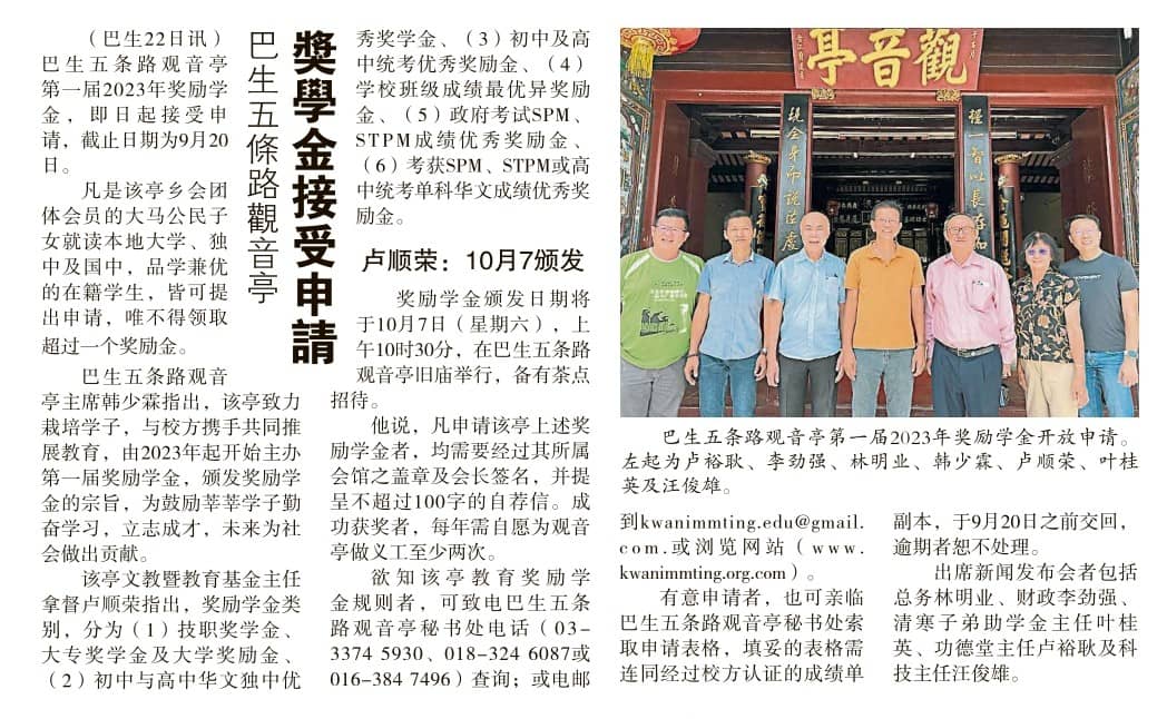巴生五条路观音亭第一届2023年奖励学金现已开放申请,