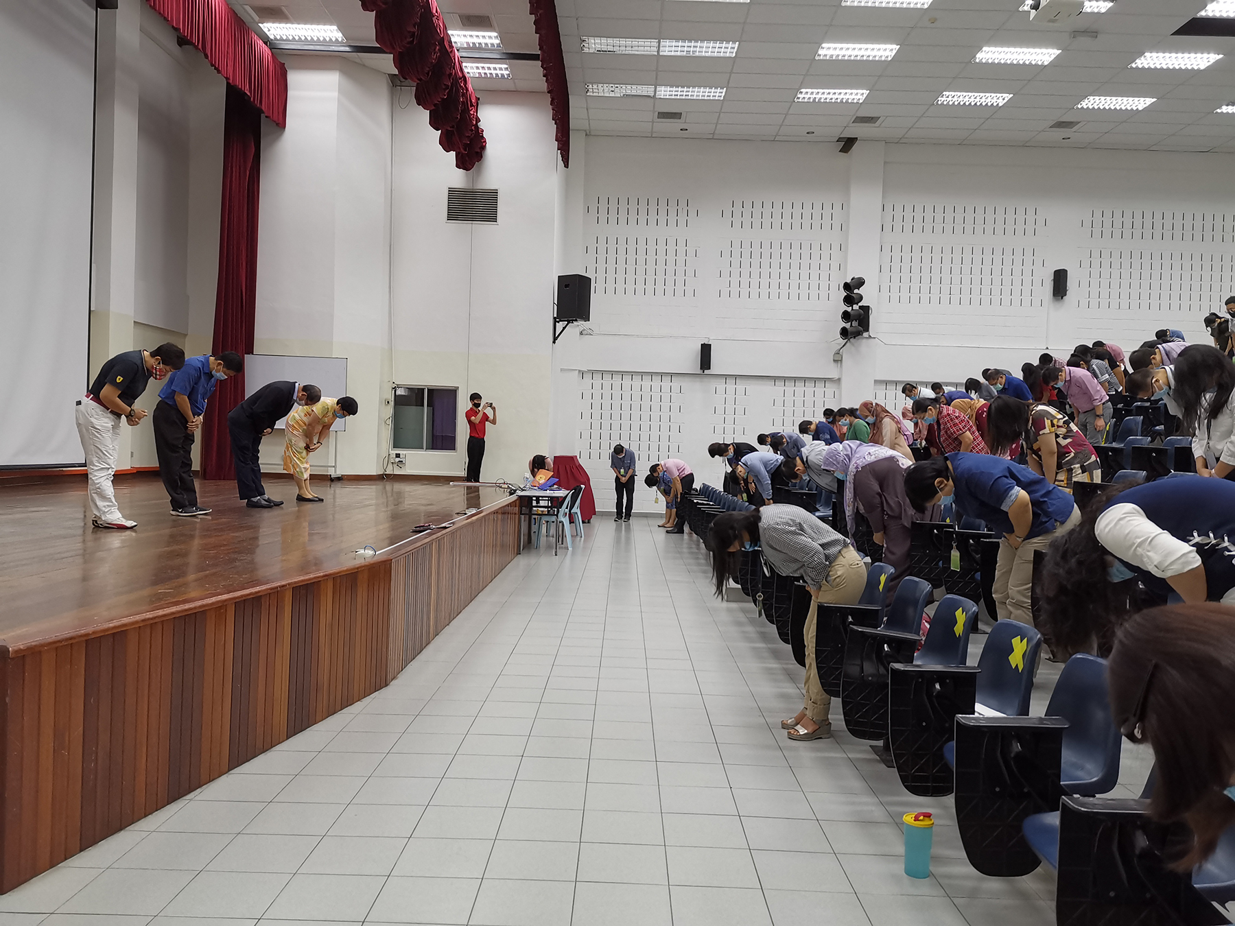 在简单的教师节庆典活动结束前,董事与教职员相互鞠躬,感恩彼此为光华独中的付出。 |