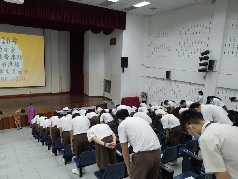 佘琼凤校长率领受惠学生向善心人士鞠躬,希望学生能保有滴水之恩,涌泉相报的感恩之心。