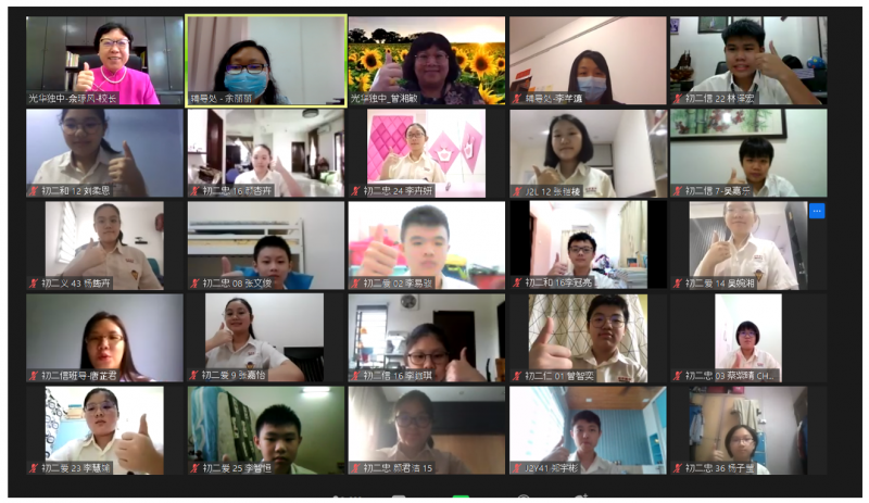 训导处主任曾湘敏则以本校校训“诚勤俭毅”勉励学生,提醒大家在居家学习期间,需诚实面对学业,妥善规划学习与娱乐的时间,同时也要善用网络资源,不要玩物丧志。