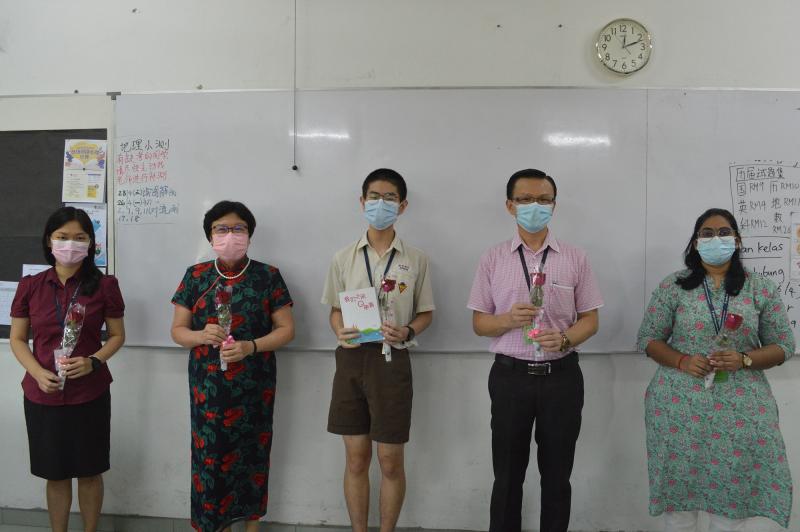 佘琼凤校长(左二)颁发玫瑰予初三义班“最佳说书人”——潘一正(中);左起为班导师陈晓莹、邱桂平副校长和助理班导Gauriswari。