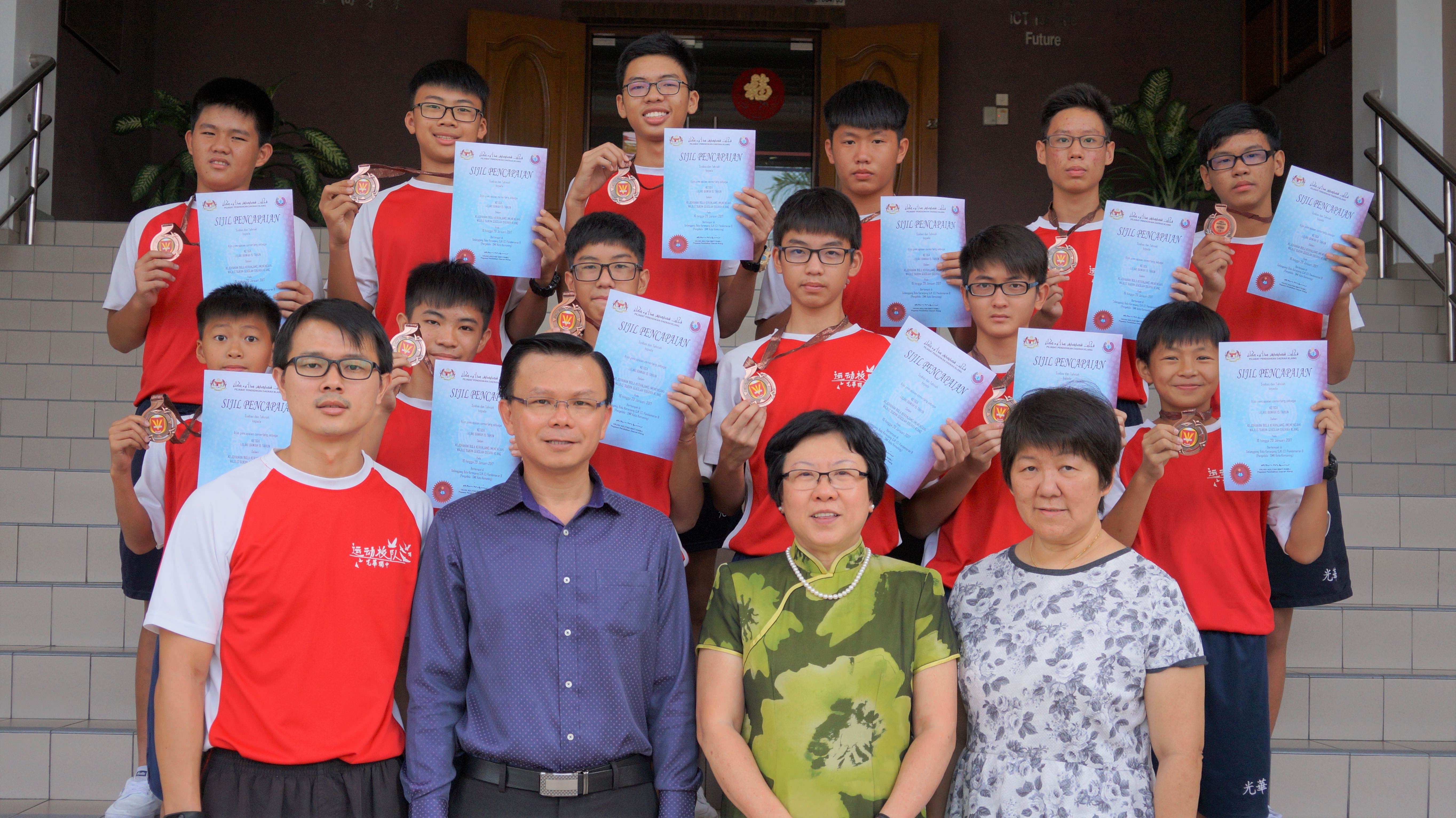 巴生光华独中篮球校队在巴生县篮球学联赛获得3铜,图为男子15岁以下组季军得主与体育处主任刘健豪(左起)、副校长邱桂平、校长佘琼凤和 副校长蔡翠蓉合影。