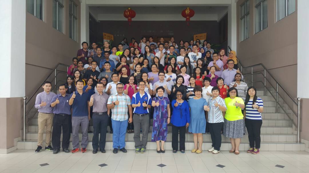 为精进老师的教学及促进专业成长,巴生光华独中同时间举办了三场培训,即由SPM出题者Tan Chai Long博士(左五)授课的国文作文和语法培训、由马来西亚学思达教学法推手蓝志东博士(左六)授课的学思达教学法培训,以及由精英大学Jayati Roy博士(右五)授课的神经语言程序学(NLP)与英语学习培训;右六为校长佘琼凤。