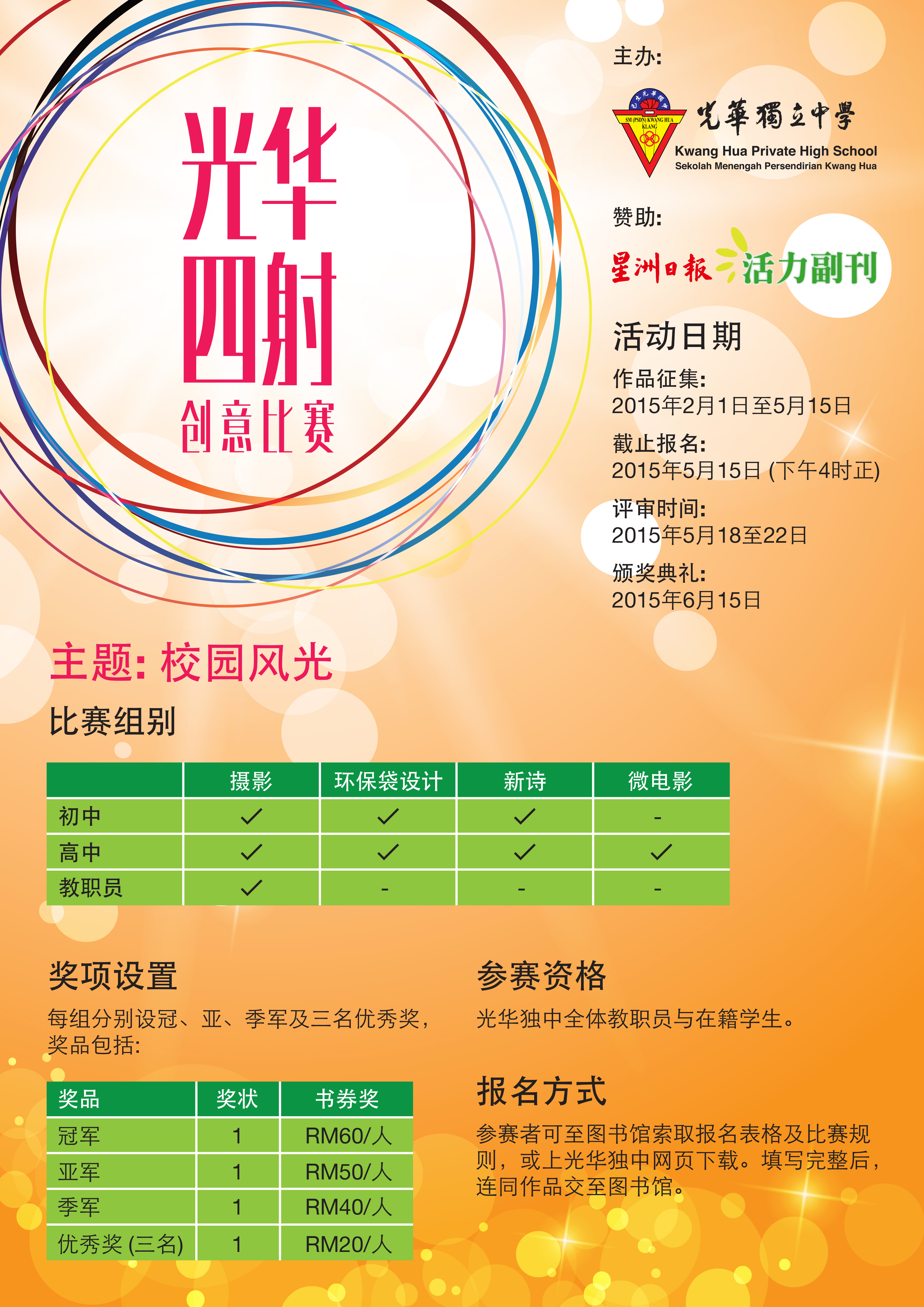 由资源处主办、星洲日报活力副刊赞助的2015年光华四射创意比赛从2月1日起开始征件,截止日期为5月15日下午4时正。