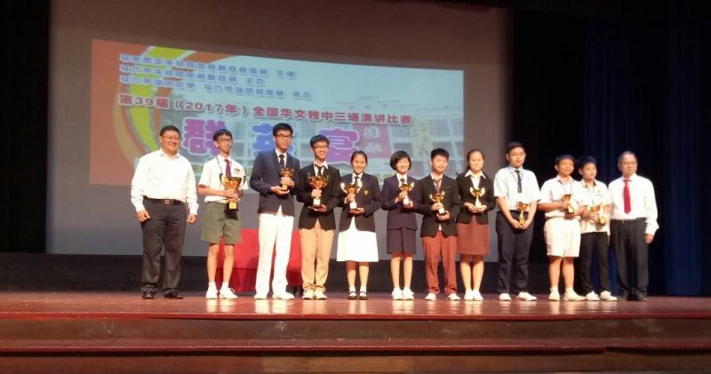 学生陈静嘉(右五)于全国华文独中三语演讲比赛荣获初中组国语冠军,以及三语总成绩亚军。