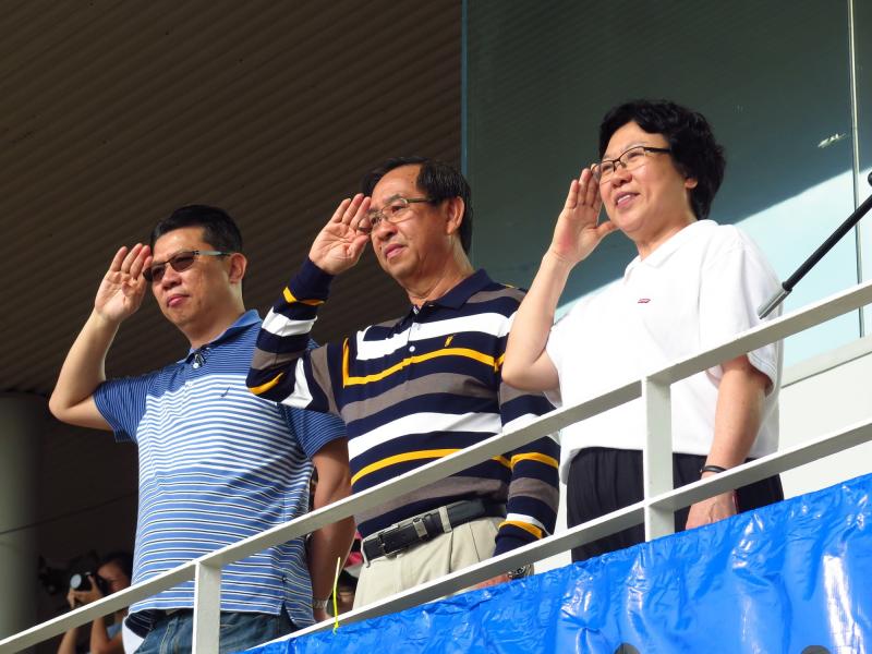 巴生光华独中董事长谢璇苞(中)在校长佘琼凤(右)、总务拿督吕志伟 (左)的陪同下,检阅入场的运动队伍。