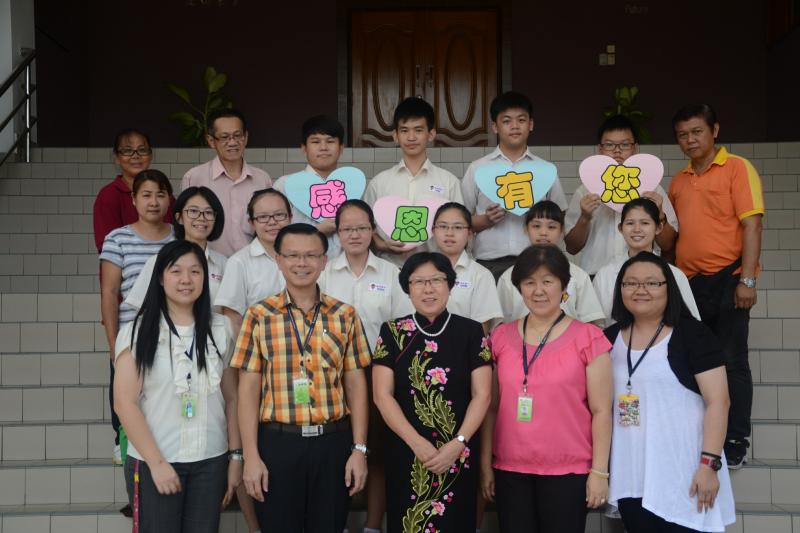 巴生光华独中校长佘琼凤(中)率领辅导处主任李芊潓(左起)、副校长邱桂平和蔡翠蓉、副主任余丽丽、受惠学生及其家长,感谢黄狮父子的善心。
