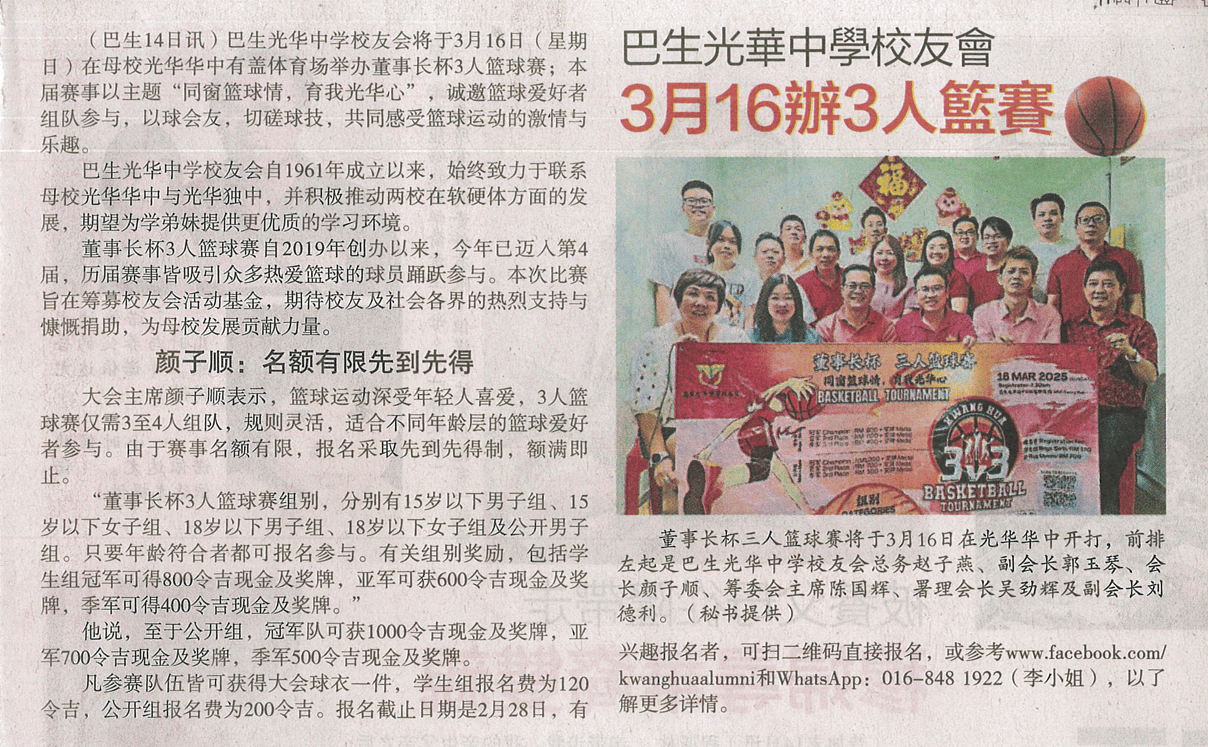 星洲日报 巴生光华中学校友会3月16办3人篮球赛