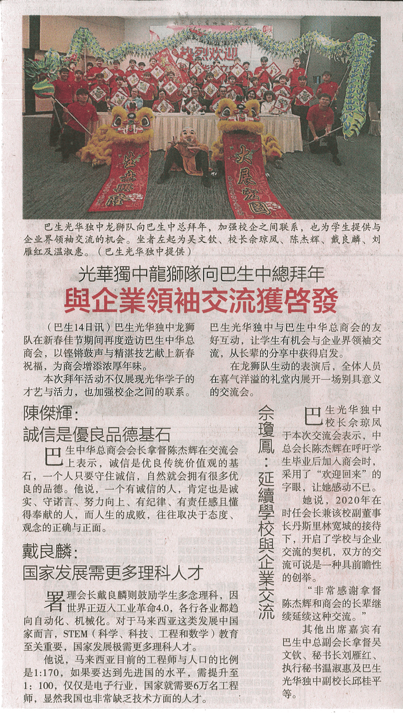 星洲日报 光华独中龙狮队向巴生中总拜年 与企业领袖交流获启发